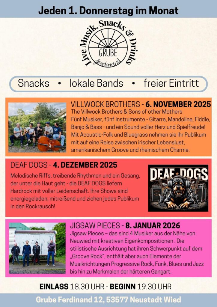Erlebt regionale Bands live in der einzigartigen Atmosphäre der Grube Ferdinand und genießt unsere leckeren Flammkuchen und kühle Getränke.